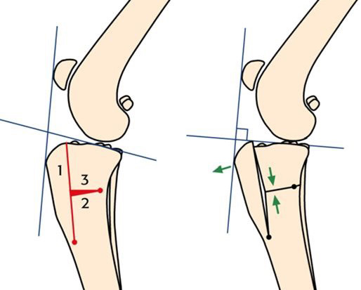 Shear force develops because the dog's tibial plateau - the weight bearing surface of the joint - is sloped caudally (downwards towards the back of the joint) and there is an acute angle between the tibial plateau slope and the patellar tendon.